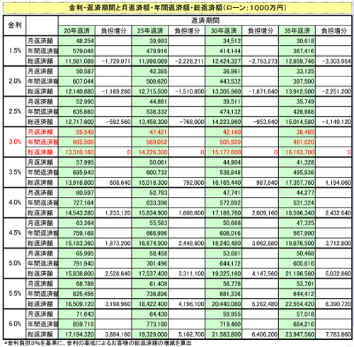 住宅ローン金利が上昇することによって、お客様の負担はどれほど増えるのでしょうか?下の表は住宅ローンで1,000万円を借りた時に、固定金利の場合、金利の上昇によって返済額がどう変わるかをみたものです。